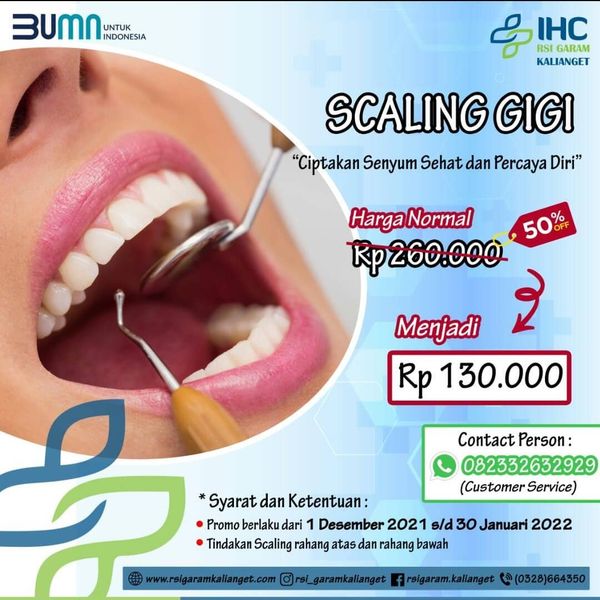 B. PAKET SCALING GIGI ( PROMO 1 DESEMBER 2021-30 JANUARI 2022, Rp130.000,- ) DISKON 50% SELAMA PERIODE PROMO