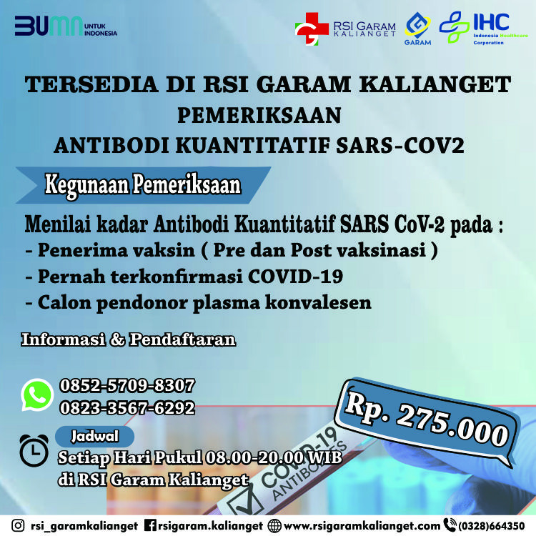 Assalamualaikum Sahabat Sehat RSI Garam Kalianget, telah dibuka Layanan Skrining Covid-19 Garam Kalianget terdiri dari Rapid Tes Antigen dan Rapid Tes Antibodi. Bagi sahabat yg ingin mediteksi secara dini dan CEPAT bisa mengakses layanan ini, dan reservasi di nomor yang tertera. Melayani untuk masyarakat umum maupun Instansi-Perusahaan.Terimakasih.Salam Sehat