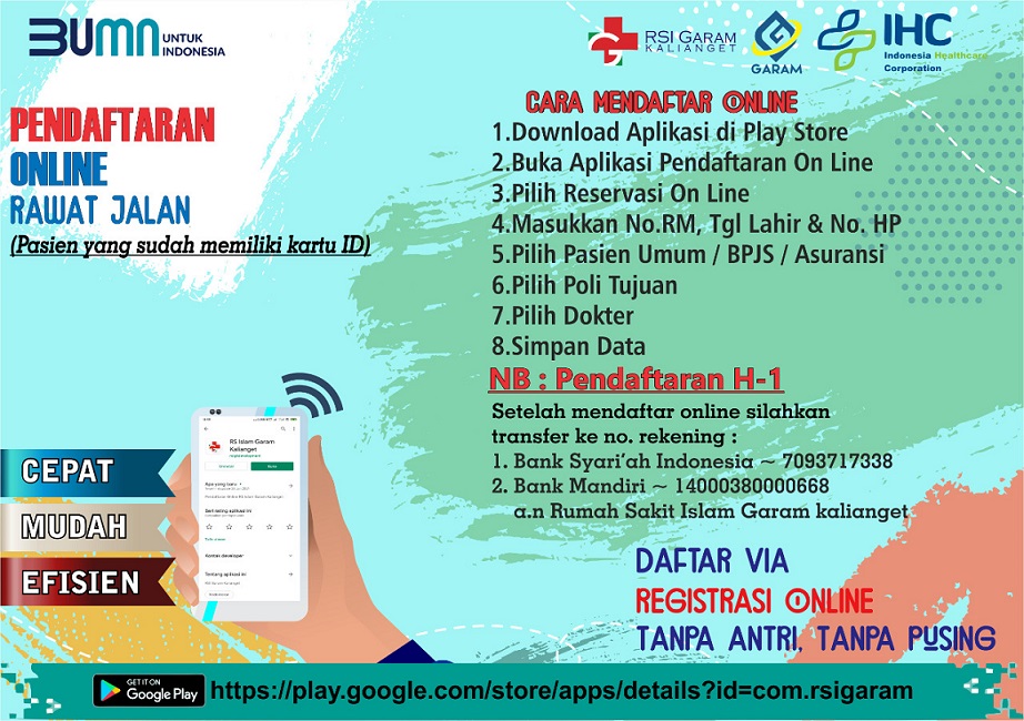 Assalamualaikum wr wb Sahabat Sehat RSI Garam Kalianget. Alhamdulillah di Bulan Suci Ramadhan ini, RSI Garam Kalianget Luncurkan Aplikasi berbasis Teknologi Digital Yakni Aplikasi Pendaftaran Online Pasien Rawat Jalan dan Layanan Telemedicine. Pertama, Untuk Aplikasi Pendaftaran Pasien Online Poli Rawat Jalan bisa didownload di HP anda semua di Playstore : https://play.google.com/store/apps/details?id=com.rsigaram Aplikasi ini bisa dinikmati Para Pasien Rawat Jalan yang sudah atau pernah Periksa di Poli Rawat Jalan. dengan adanya Aplikasi yang bisa didownload di HP android ini, maka akan memberikan kemudahan bagi Pasien Poli Rawat Jalan sehingga tidak perlu lagi antri ke rumah sakit untuk daftar.
